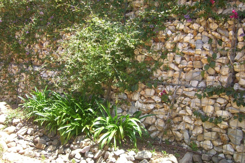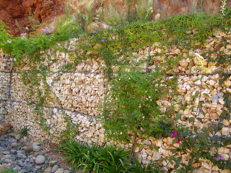 Als perfekte Verbindung zwischen Gestaltung und Funktion (Hangabsicherung) eignen sich Gabionen (mit Steinen gefüllte Drahtkörbe). Höhere Stützmauern können sehr gut mit Gabionen erstellt werden.